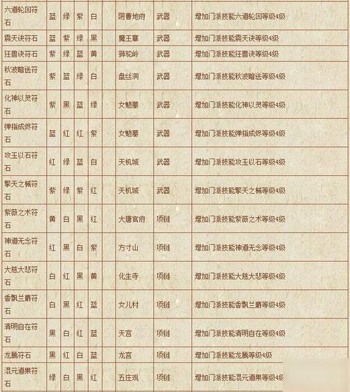 明性修身符石:红、绿、黑,五庄观,腰带,增加门派技能明性修身等级2级。
